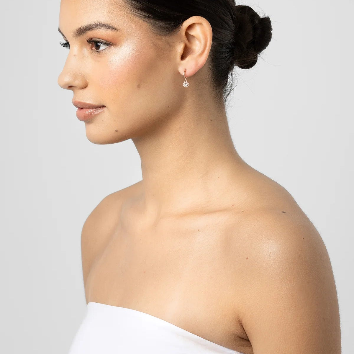 Tiny flower shaped pearl earrings Microplated 12k gold finish Nickel free Stainless steel posts We...